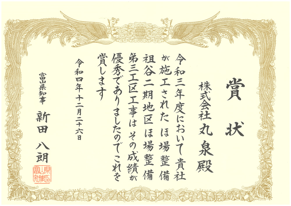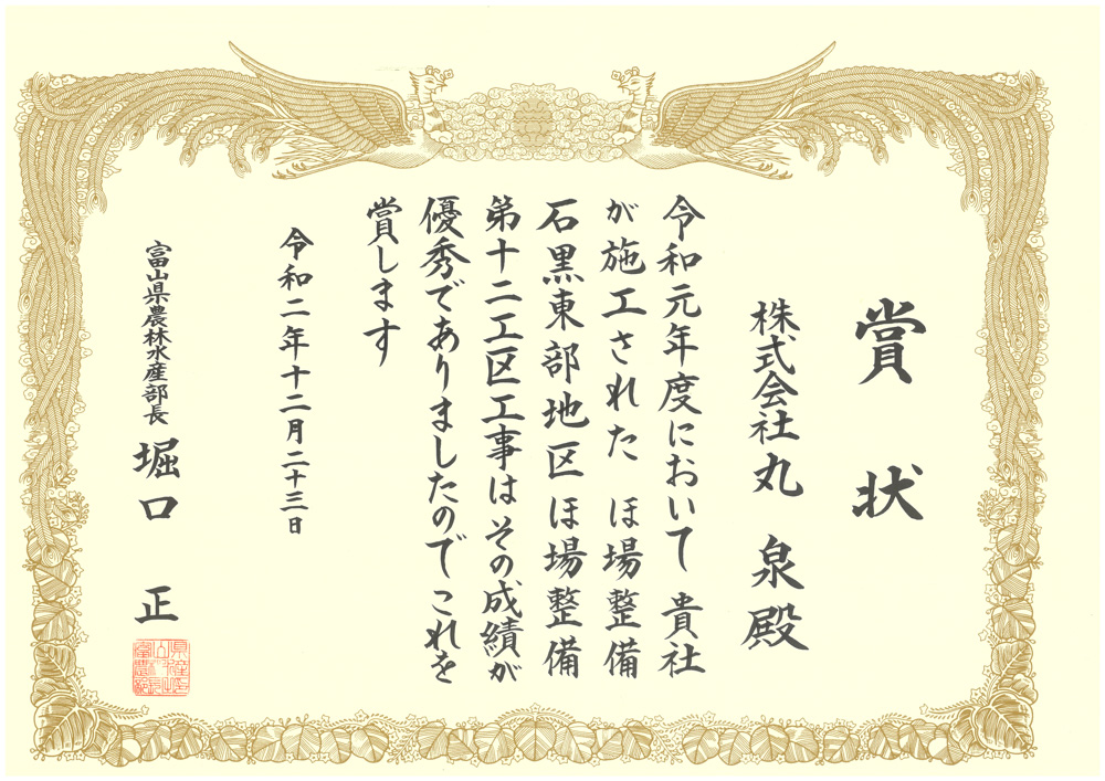 当社は、これまで数々の施工した案件において、富山県、南砺市より高い評価を受け、多くの表彰をいただいております。