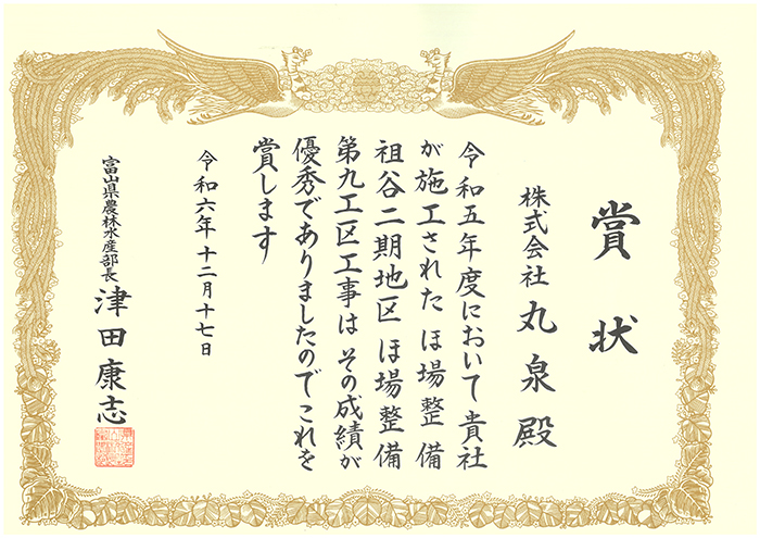 この度、当社が施工を担当した「祖谷2期地区ほ場整備 第9工区工事」が、その優れた技出力と品質の高さを評価され、農林水産部長賞を受賞いたしました。